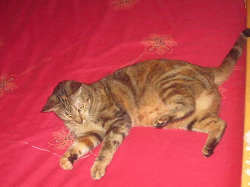 Ontem, a Tica estava em cima da minha cama. Quando andamos ocupados e não lhe podemos dar atenção, deita-se lá, sozinha. Também é o sítio onde ela agora mais gosta de brincar.