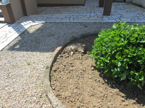 Quem a quer ver contente, e à dona à beira de um ataque de nervos, é deitada a esfregar-se na terra do canteiro do vizinho!